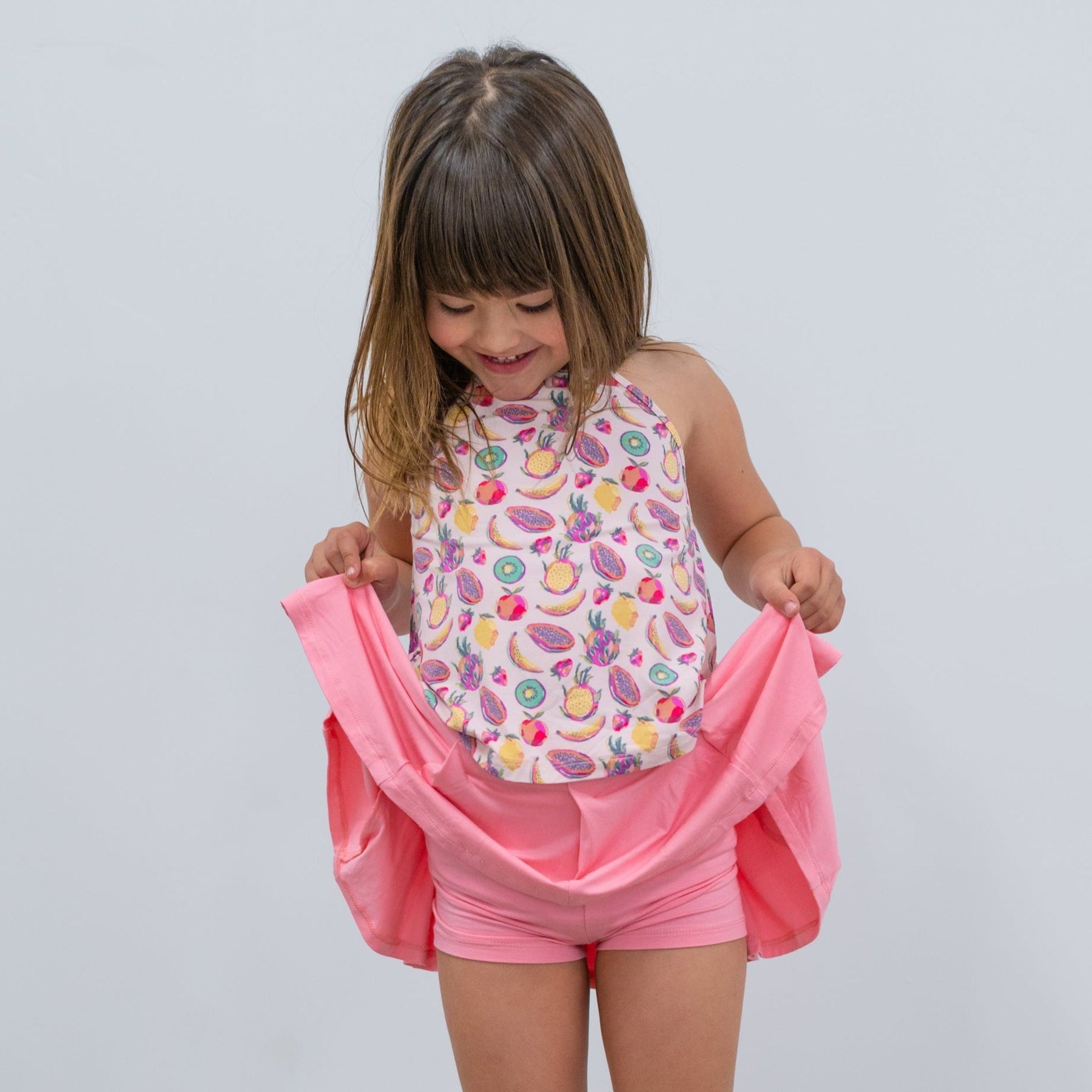 Our pleated skort is as comfortable as it is cute. Your daughter will honestly LOVE wearing this skirt for every occasion! It's a great partner for t-shirts, sweaters, and blouses! The built-in shorts all her to play without worry. Made with our signature fabric and finished with our tag-less, silk screen label for total comfort!
