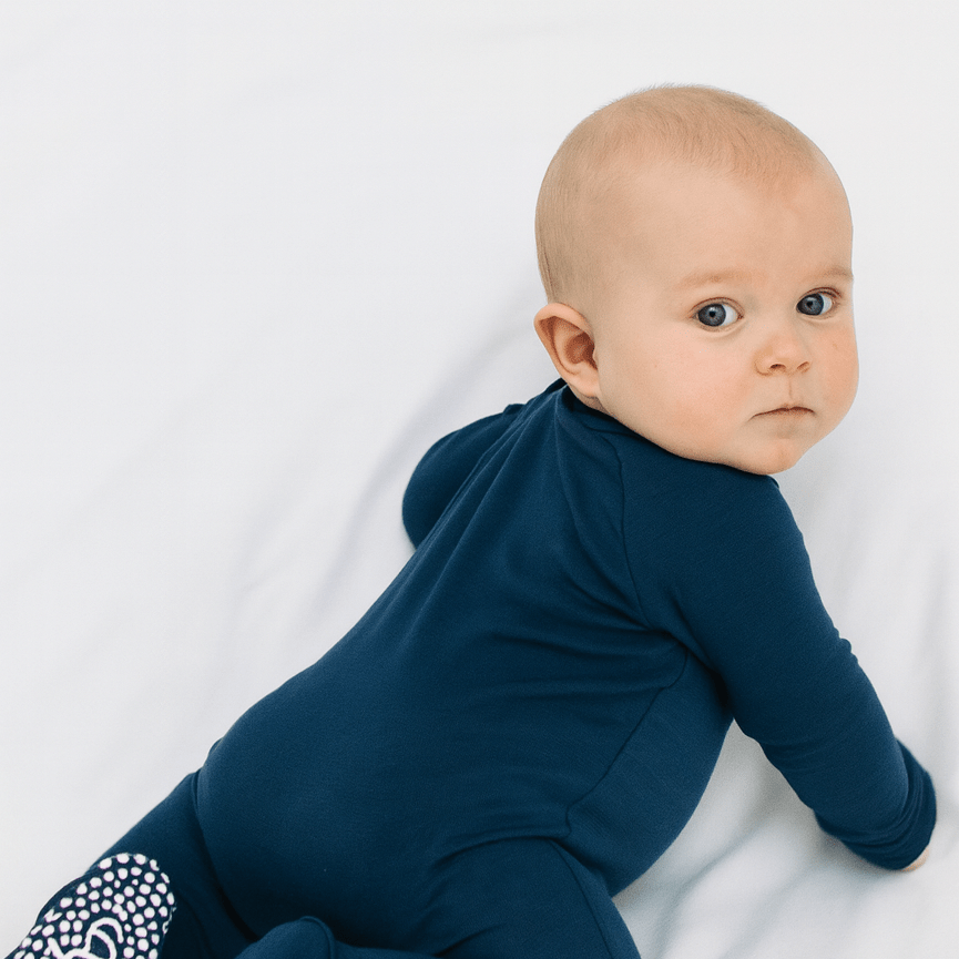 Ask and you shall receive. This yummy footie is equipped with a smooth 2-way zipper, silicone grips on the foot pads and fold-over handcuffs. Plus our silky-soft fabric hugs in all the right places to show off those baby curves.